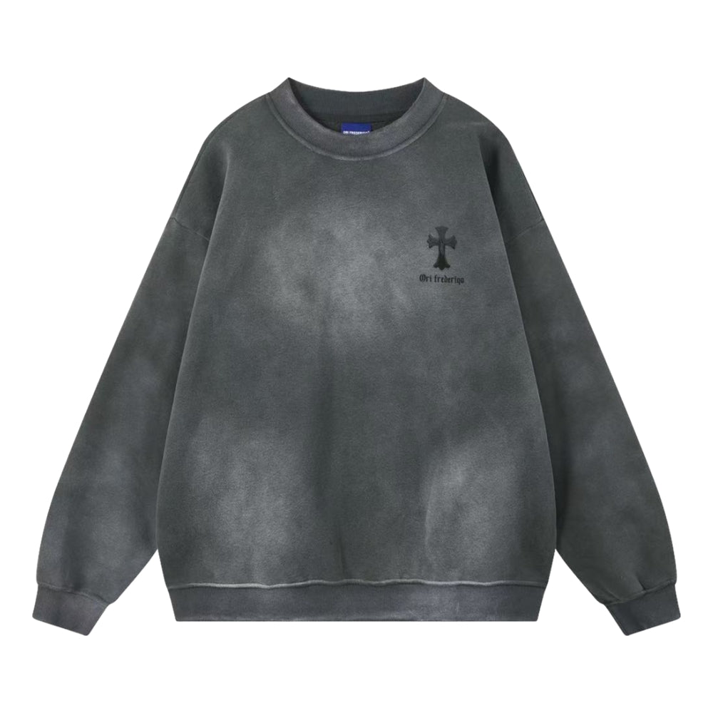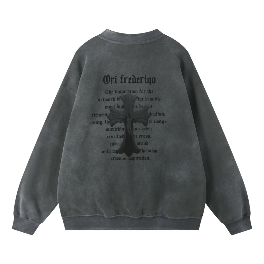 ORI FREDERIQO WASHED PRINT FLEECE CREWNECK SWEATSHIRT-DARK GREY