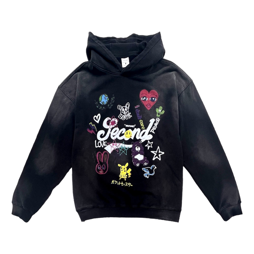 2ND CLOSET HAND DRAWINGS PRINTED WASHED HOODIES-WASHED BLACK