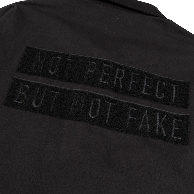 "NOT PERFECT BUT NOT FAKE" EMB. ON FASTENING TAPE ON FRONT AND BACK