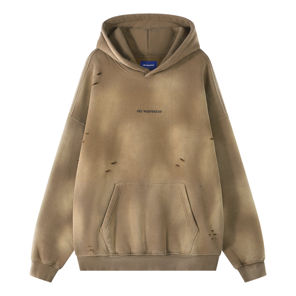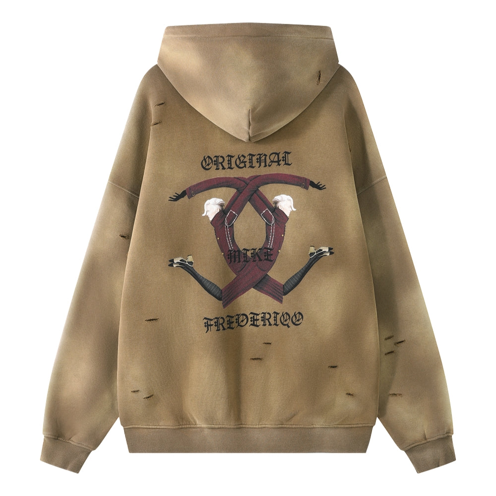 ORI FREDERIQO WASHED PRINTED ZIP UP TERRY HOODED SWEATSHIRT-KHAKI